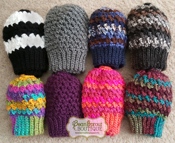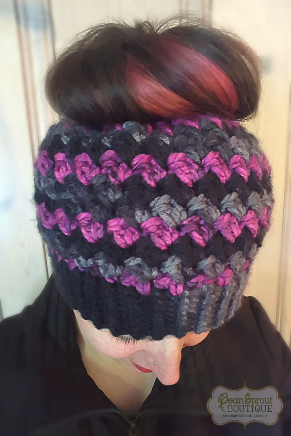 You can wear your hair in a messy bun and still keep your head warm! This is the perfect crochet hat for a bad hair day. The elastic banded opening in the top of this hat accommodates ponytails and messy buns. The bulky yarn is warm and cozy with lots of color options.