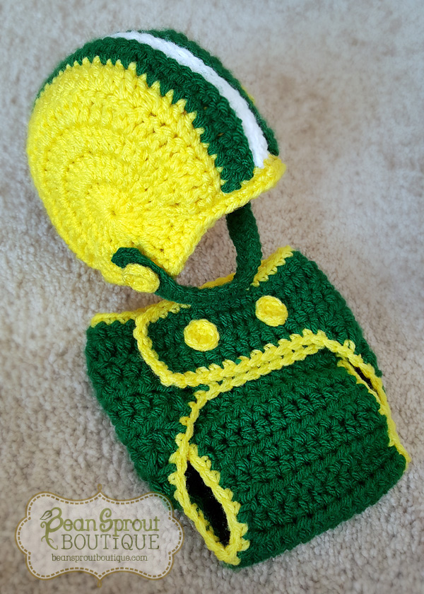 The perfect accessory for football season. This crochet football helmet earflap hat and diaper cover are great as a photography prop for newborns. Choose your team colors.