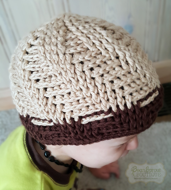 The spiral herringbone design of this beanie gives this crochet hat a unique texture everyone is sure to love.