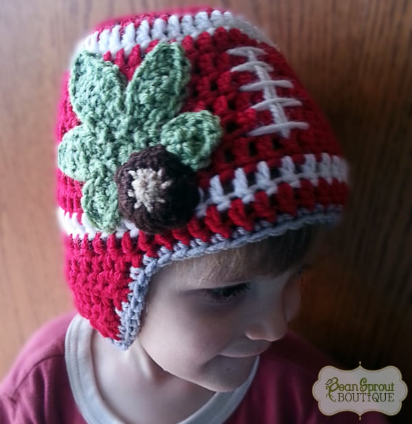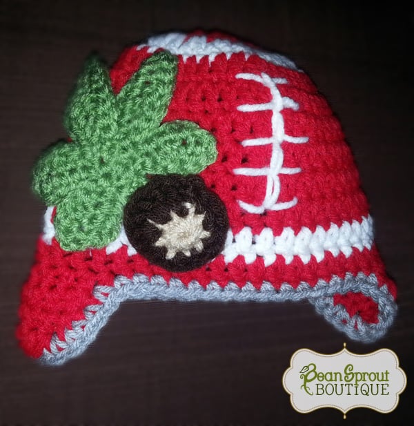 Show your team spirit with this crochet football earflap hat in OSU colors. Great as a photography prop for newborns. Hat features a buckeye leaf and a buckeye.