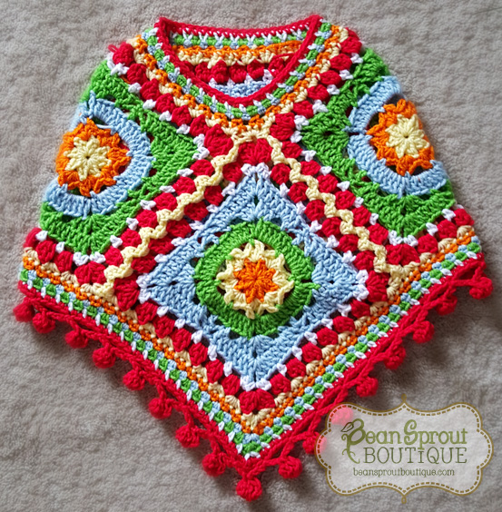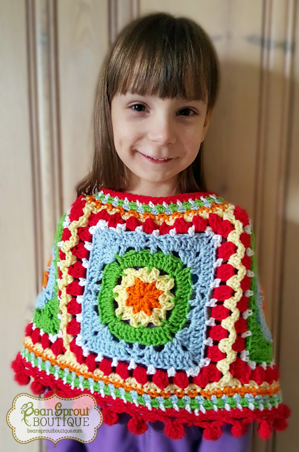 This trendy retro, boho poncho is pretty and cozy. It features pretty squares with a pompom edge. Perfect accessory for cool weather or layering through all seasons.